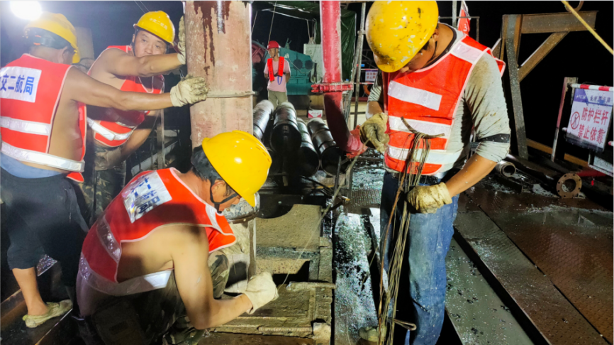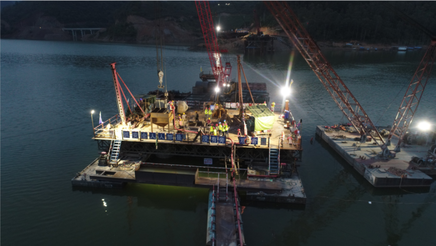 經過近10個小時緊張有序的施工,八渡三橋首根深水樁基順利完成灌注施工,標志著八渡三橋施工正式拉開帷幕,為后續水上浮式平臺施工作業積累了經驗并打下堅實的基礎。
