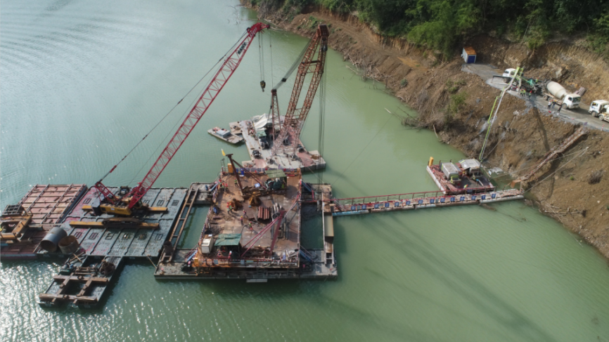 八渡三橋特大橋為田定路全線重難點控制性工程,橋址位于田林縣八渡鄉八渡新村附近,橫跨馱娘江。橋梁主墩1#、2#墩位于瓦村水庫深水區范圍,最大水深46米,水下地質構造復雜。施工工藝復雜、技術難度大、安全風險高。