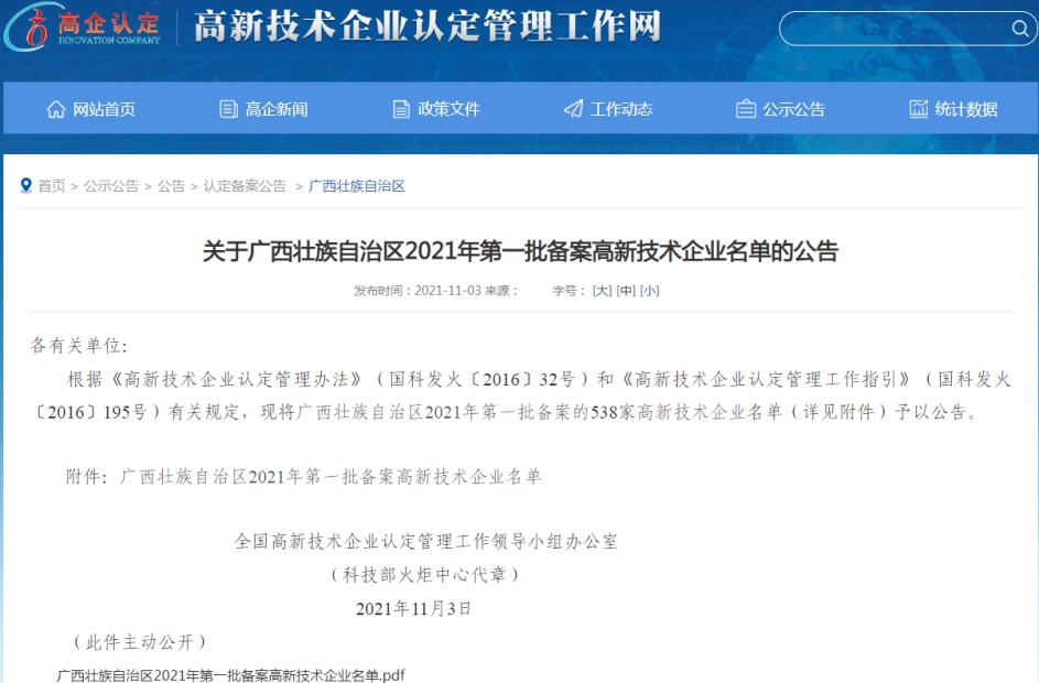近日,高新技術企業認定管理工作網公布了廣西壯族自治區2021年第一批備案的538家高新技術企業名單,北投公路集團直屬企業廣西強路工程咨詢有限責任公司名列其中。