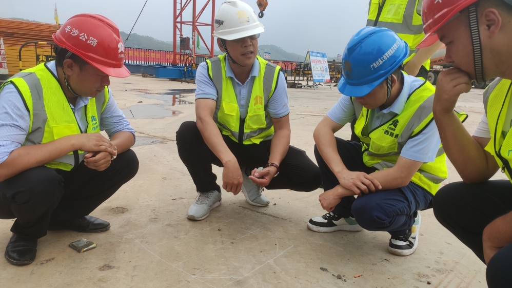 面對嚴峻復雜的施工環境和急難險重的施工任務,南寧片區項目建設辦一線青年員工充分發揮生力軍和排頭兵作用,一邊督促施工單位通過科學調整作息時間和班組輪換作業,加強過程控制;一邊積極優化施工方案,對封底方案的可行性組織專家論證,最大限度降低施工安全風險;同時組織召開施工前交底會議,對現場質量安全卡控、三位一體防護等工作責任落實到人。最終在超大洪峰來臨前順利實現圍堰著床封底,有效強化了圍堰抗水流沖擊能力,進一步保證了鋼棧橋及作業鋼平臺結構安全。