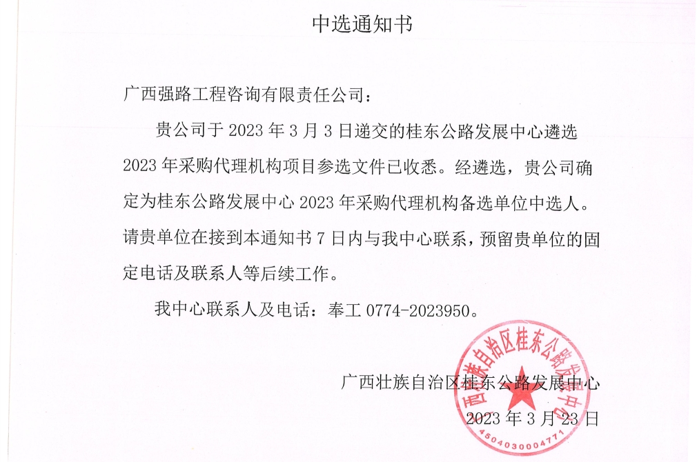 3月23日,北投公路集團直屬企業強路公司順利通過桂東公路發展中心審批,入選該中心2023年度采購代理機構庫。