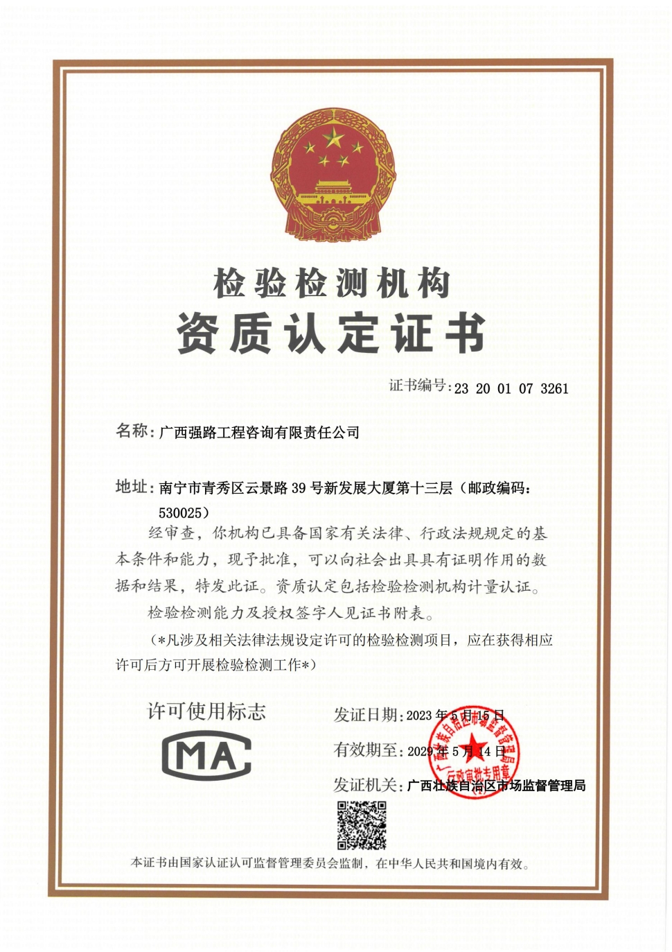 5月17日,北投公路集團直屬企業廣西強路工程咨詢有限責任公司取得CMA《實驗室資質認定(計量認證)》資質證書,標志著強路公司公路試驗檢測中心通過國家計量認證,可面向社會出具具有法律效力的試驗數據和檢測結果,真正意義上可獨立承攬等級范圍內的公路工程試驗檢測業務。