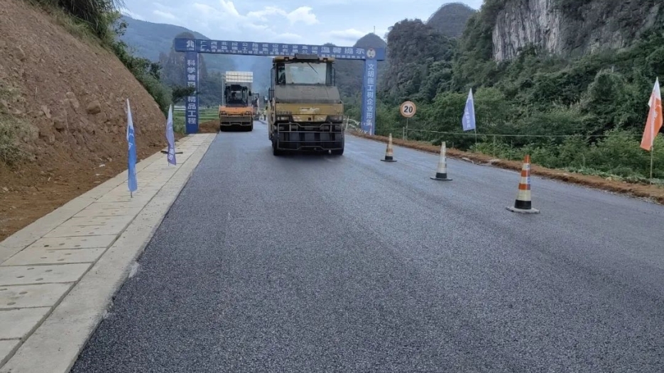 8月1日,桂林片區(qū)全高路(興安段)瀝青下面層試驗(yàn)段攤鋪?lái)樌瓿桑舜螖備仦r青試驗(yàn)段全長(zhǎng)200米,下面層結(jié)構(gòu)類型為AC-20瀝青混凝土,鋪筑厚度為5厘米。圌