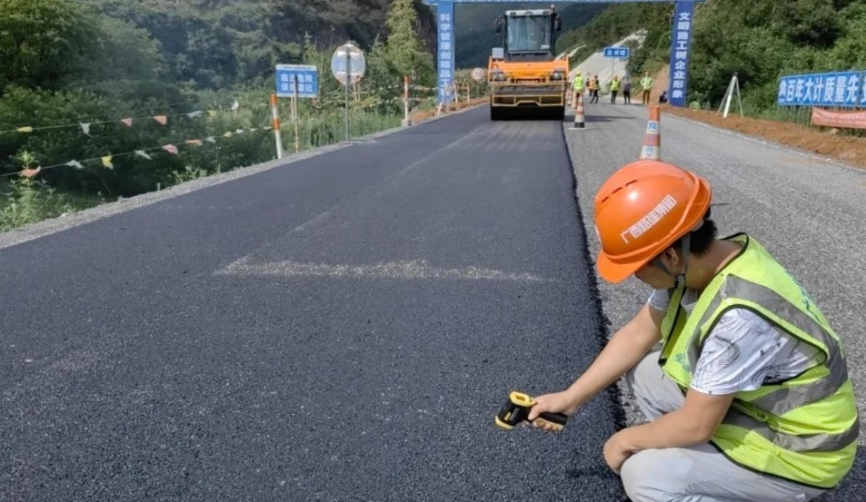 圖為現(xiàn)場(chǎng)管理人員核查瀝青面層溫度